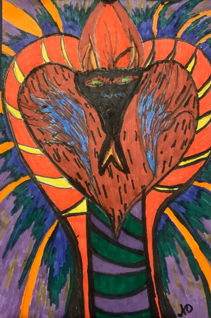 Heston felt her anguish and changed back to his Dragonflairy form and very humanoid of him , put his winged arm around her , sat in silence and let her cry !