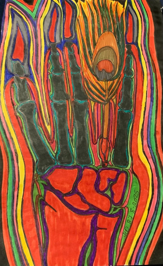 She sat and remembered and the hot angry tears felt again. She had shook her head and the spot that had just healed over opened . He had been stretched out on the bed sideways, just looking at her sit and write . Her wings out , so ,delicate . She sat and the blood flowed quite nicely down her into her back of her wings and then spread out into the veins of her wings and glowed. He saw them open wide and pulsate with renewed energy. Her mixed blood oath combined blood , renewing and being absorbed within the wings ‘veins .Her