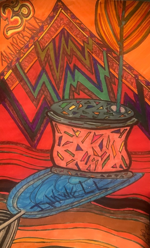 The glaze came from blood , feathers, bones, sinew and tendons of the sacrifices that were made to say ” thank you” to those that be ,that made it all happen. It was pounded with mortar and pestle , the same that ground the spices and herbs that made up for medicinal purposes. Blood was dripped in and the deep earth from our mountain was added. The mixture was blended that formed the clay and was moulded into shape, a small lid that must have fallen off and lost to time. The glaze was made by liquifing the clay and own family blood to bind the ties were added. This blood came from all Celestial and Diablo beings, they came down and spilled and dropped and left back into the above as they rode up the mountain into the skies above and up and out within the Universe that had created our Worlds.